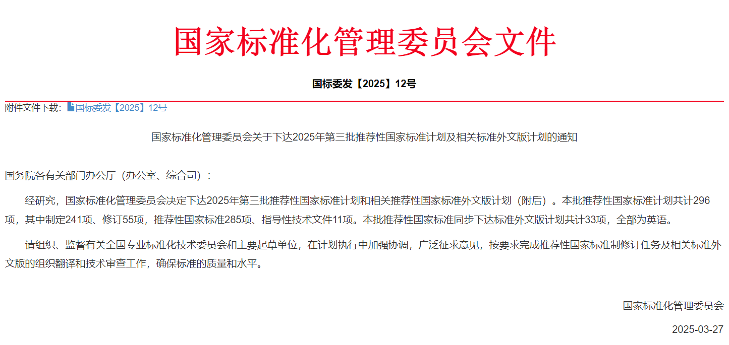 2025年3月27日,国标委发[2025]12号,国家标准化管理委员会下达了关于国家标准《工业机器人静电安全规范》等推荐性国家标准计划。