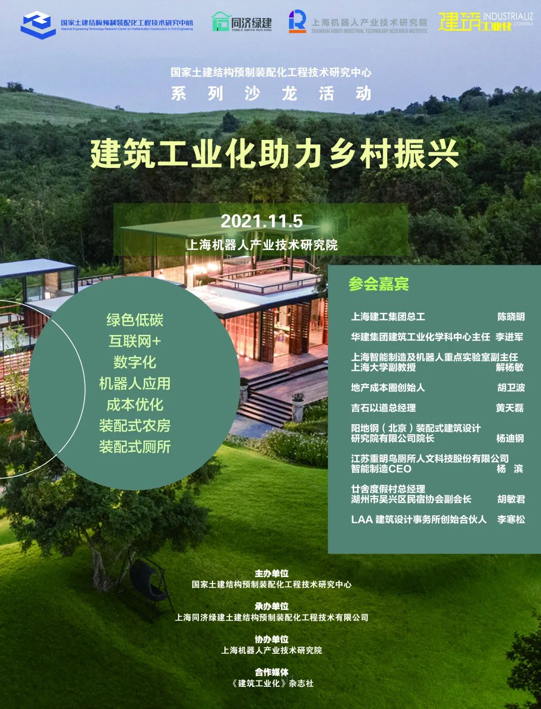 本次沙龙是同济大学国家土建结构预制装配化工程技术研究中心系列沙龙活动之一,开启线下沙龙、线上同步直播的形式。尽管疫情影响,线下的各位嘉宾倾情分享,观众踊跃参与,所有人收获满满并引发了听众们更多的交流意愿。本次活动切实做到以主题研讨、思想碰撞、交流合作等方式,打通政府、科研与产业资源,为行业创造一个互动交流的载体和空间,助力乡村振兴的发展与实现。