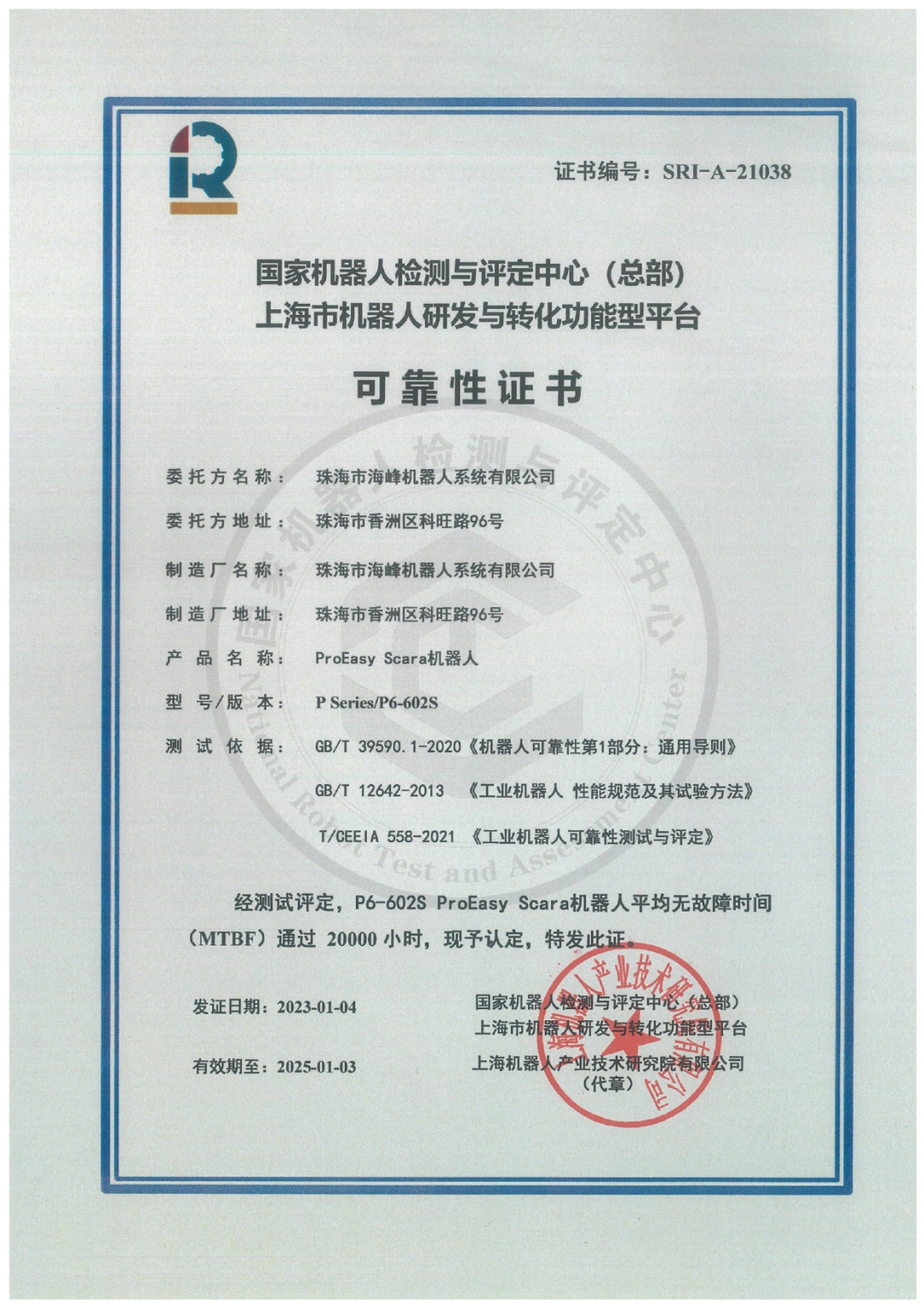 1月3日,珠海市海峰机器人系统有限公司的ProEasy 机器人P6-602s SCARA机器人顺利通过leyu.乐鱼(集团)机器人有限公司官网的MTBF 20000小时测评。